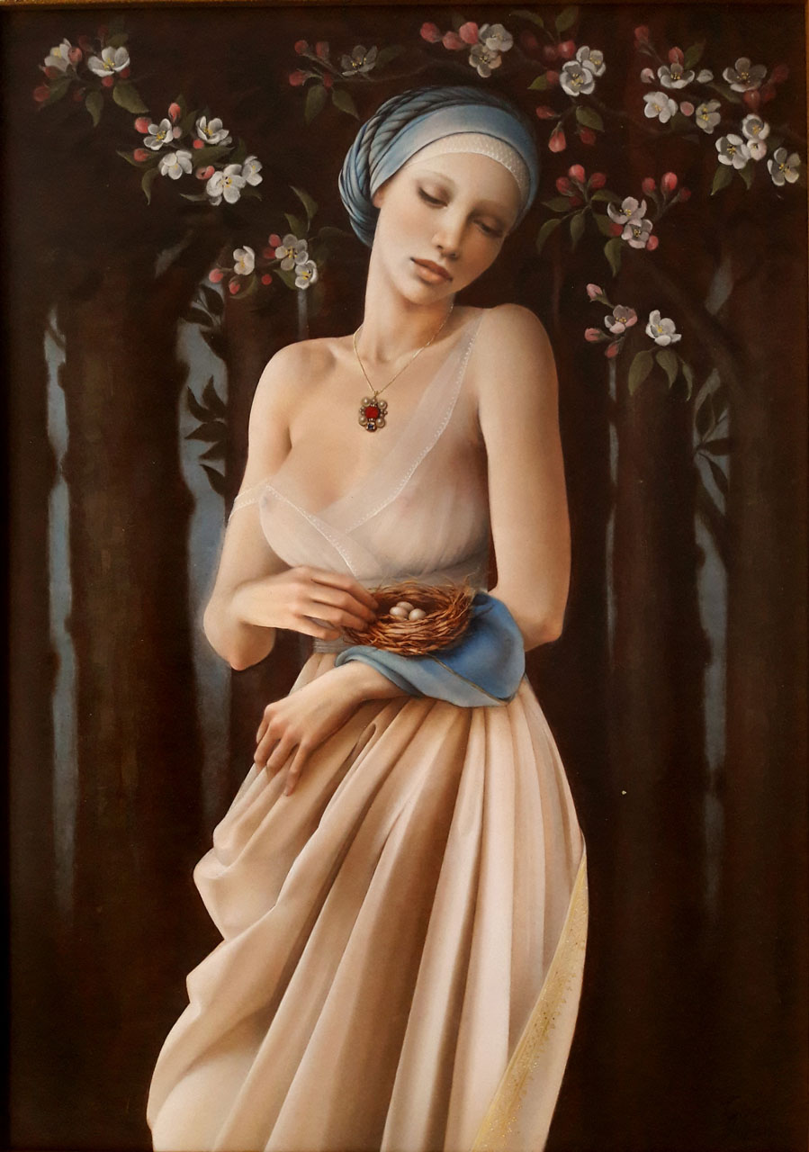 - Justyna Giza, „Gniazdko”, cyklu „Kobiety z wizerunkami białych ptaków”, 2018-2019, olej na desce, technika laserunkowa, wymiary 45×32 cm, z ramą 61×48 cm/ NIEDOSTĘPNY