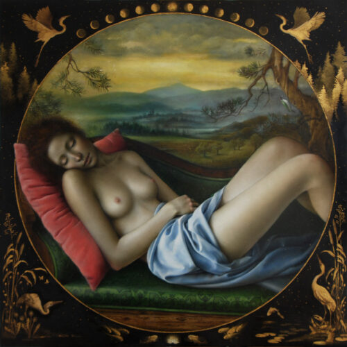 - Justyna Giza, „Śpiąca” – z cyklu „Kobiety z wizerunkami białych ptaków”, 2020-2021, olej na desce, technika laserunkowa, złocenia 24-karatowym złotem, modelowanie techniką sgrafitto i olejną, złoto mineralne, wymiary 50×50 cm, KOLEKCJA GALERII