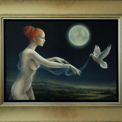 - Justyna Giza, „Biały gołąb” – z cyklu „Kobiety z wizerunkami białych ptaków”, 2016-2018, olej na desce /technika laserunkowa/, wymiary 50×70 cm, z ramą 76×96 cm, / NIEDOSTĘPNY