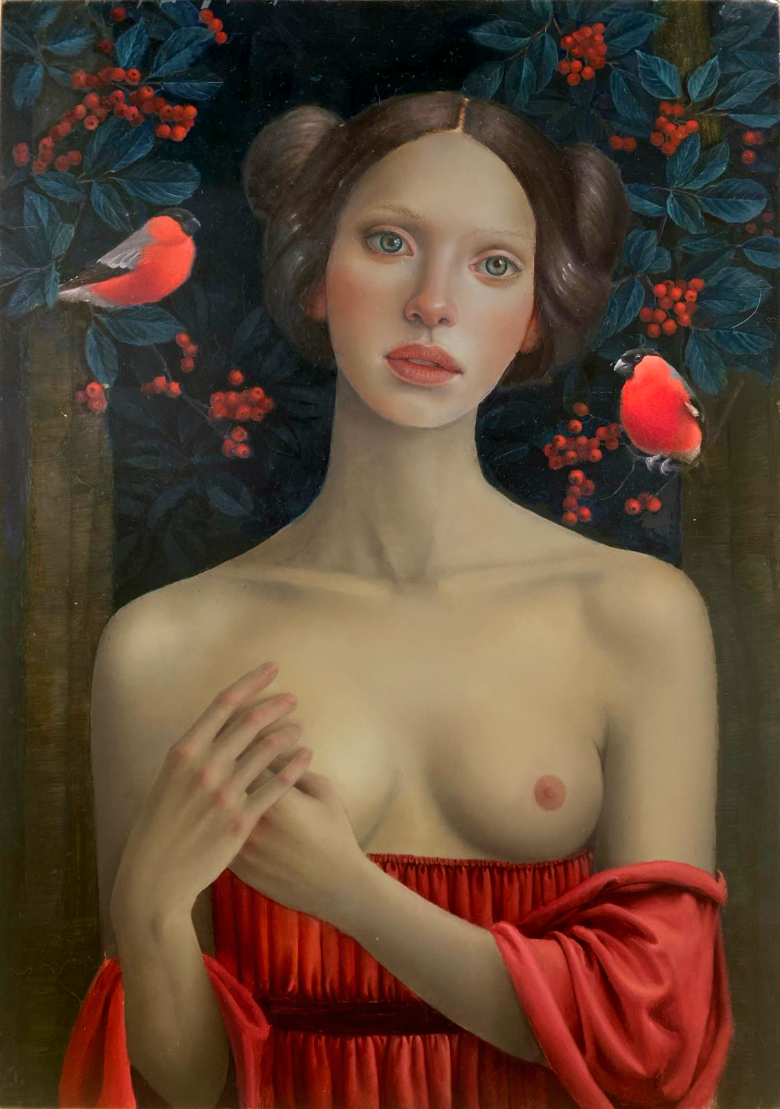 - Justyna Giza, „Jarzębina”, 2024-2025, olej na desce, technika laserunkowa, wymiary 42×30 cm
