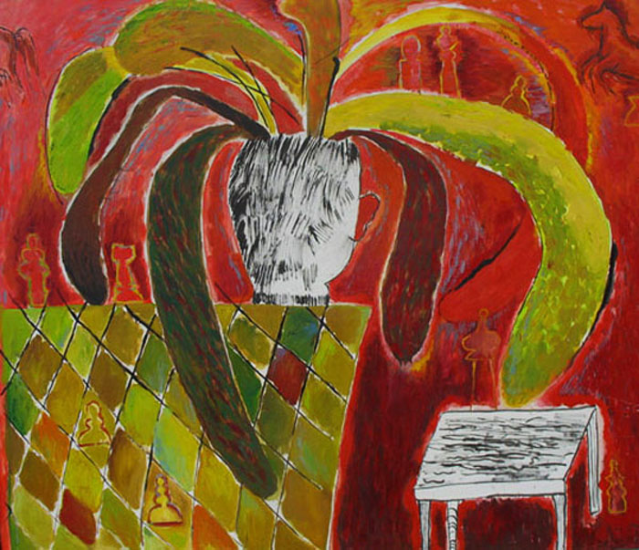 - Yolanta Nikt, „Kwiatek i szachy”, 1989, olej na płótnie, wymiary 120×140 cm