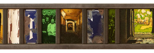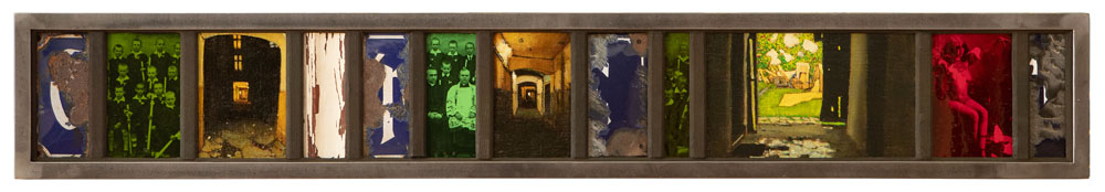 - Jacek Rykała, „Edukacja”, 2019, olej + kolaż na płótnie, wymiary 20×132 cm