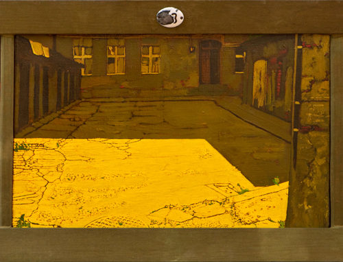 - Jacek Rykała „Dom pod siódemką”, 2019, olej na płótnie + collage, wymiary 96×75,5 cm