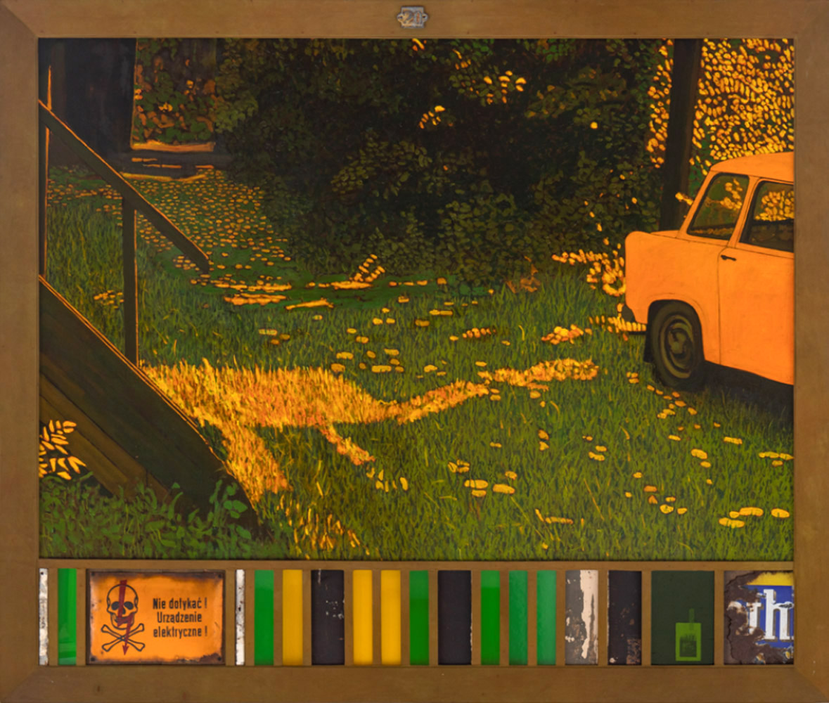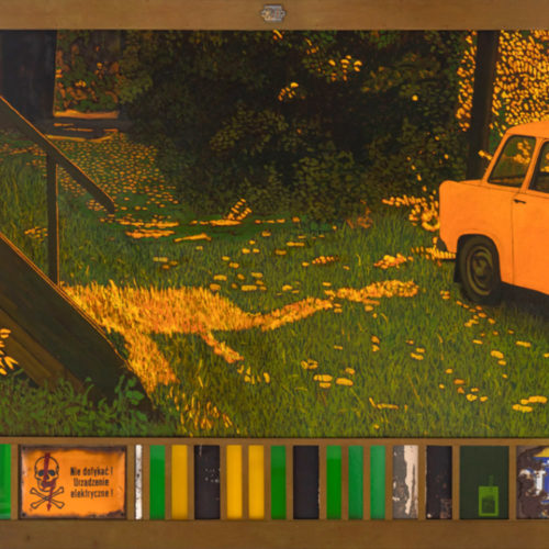 - Jacek Rykała „Popołudnie niedzielne”, 2018, olej na płótnie + collage, wymiary 156×197 cm