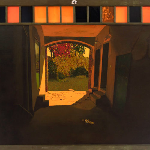 - Jacek Rykała „Żarówka na korytarzu”, 2019, olej na płótnie + collage, wymiary 160×93 cm