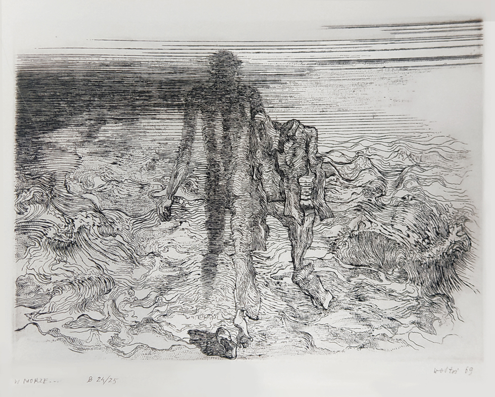 - Jacek Waltoś, „W morze…”, 1969, akwaforta, wymiary 20,5×26,5 cm